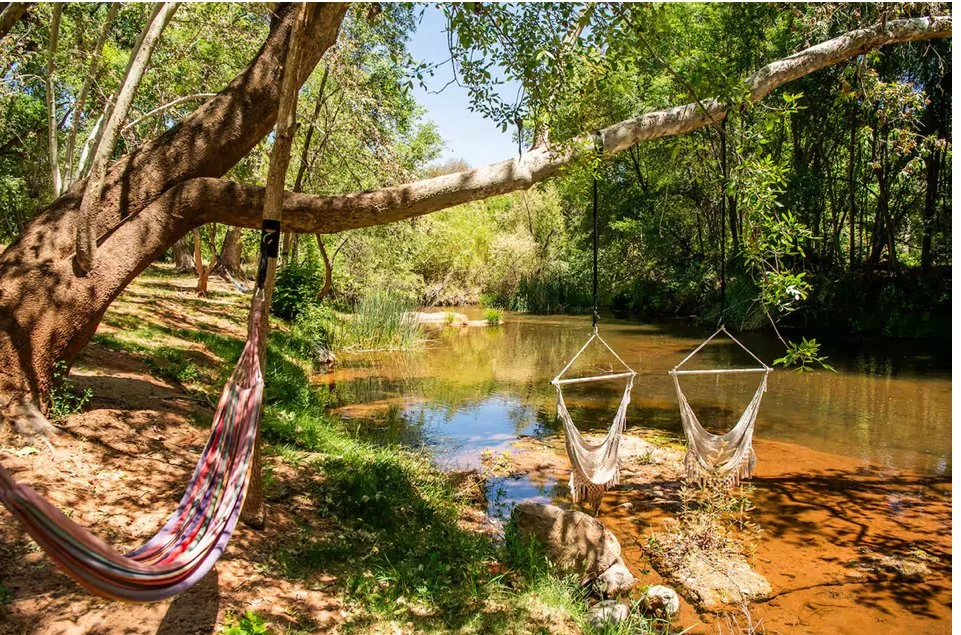 For a closer connection to nature, our Glamping Grounds include three cabins, each with two queen beds and private porches overlooking Oak Creek. The shared bathhouse includes full bathrooms, a small kitchen, laundry facilities, and a relaxing jet bath for after a day of ceremony or hiking.